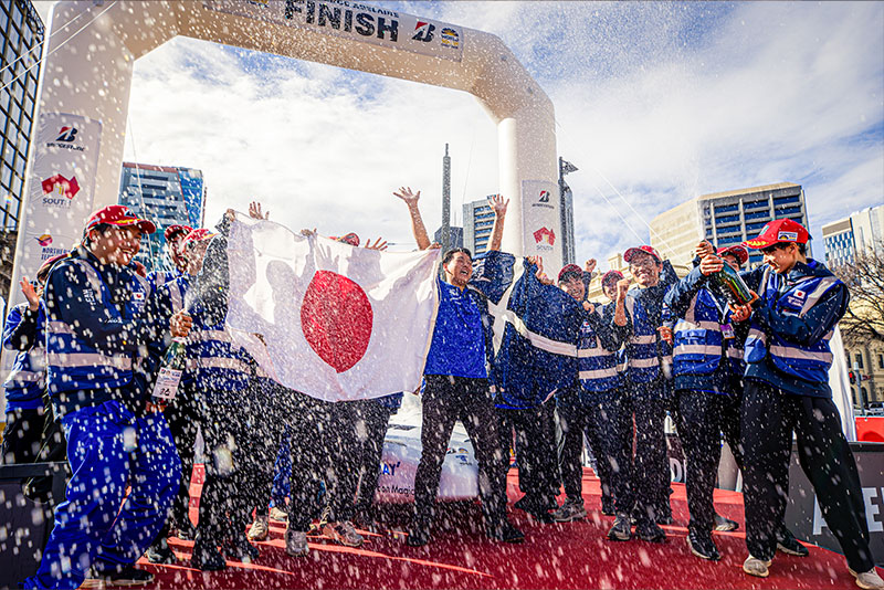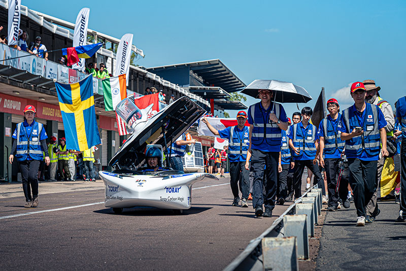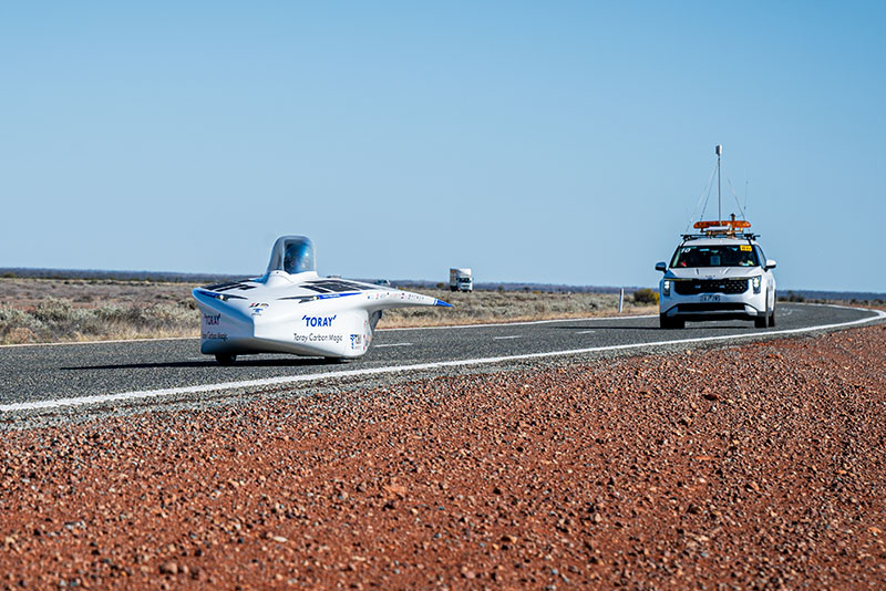 今大会は従来の10月開催から2ヵ月前倒しの8月開催となり、初の冬季開催となりました。東海大学チームは授業の合間を縫って車両の組立・仕上げを行う必要がありました。限られた作業時間の中で、6月16日の参戦体制発表会までに車両を完成させ、国内での練習走行を経てオーストラリアへ出発。現地では8月8日から整備・試走・車検を順調に進め、8月24日の大会本番を迎えました。レース中には一度タイヤのパンクによる順位低下がありましたが、その後は大きなトラブルもなく、安定した走行で完走を果たしました。ソーラーカーは、環境配慮型技術として「ECO」や「Sustainability」に適合する一方で、BWSCは、産学が連携したチームが参戦し、技術・戦略・チーム力を競い合う「競争の中で育まれる技術」の舞台でもあります。東レ・カーボンマジックは、今回の結果を踏まえ、今後も東海大学とともに世界一奪還を目指し、技術支援を継続してまいります。