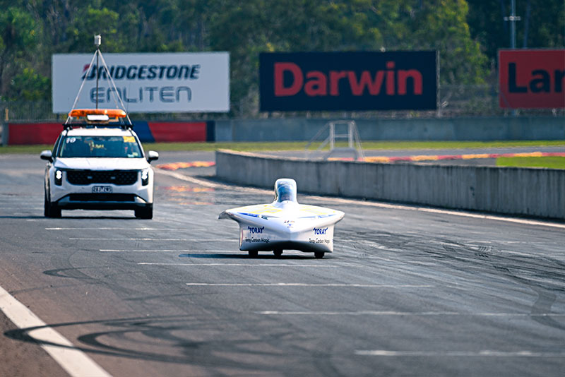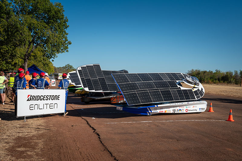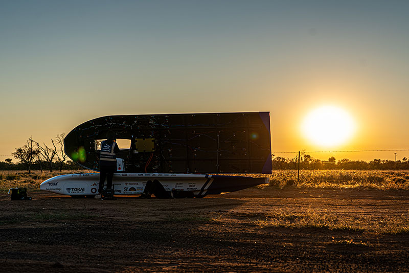 BWSCは2年に一度開催される国際大会で、オーストラリア北部ダーウィンから南部アデレードまでの約3,000kmを縦断するレースです。走行期間中は気温の変化が激しく、荒れた公道を走行するため、車両には高い耐久性と安定性が求められます。トップチームは平均時速80~100kmで数日間走行を続けるため、総合的な技術力が不可欠です。当社は、軽量かつ高剛性な車体構造の提供を通じて、東海大学チームの安定した走行性能を支えました。